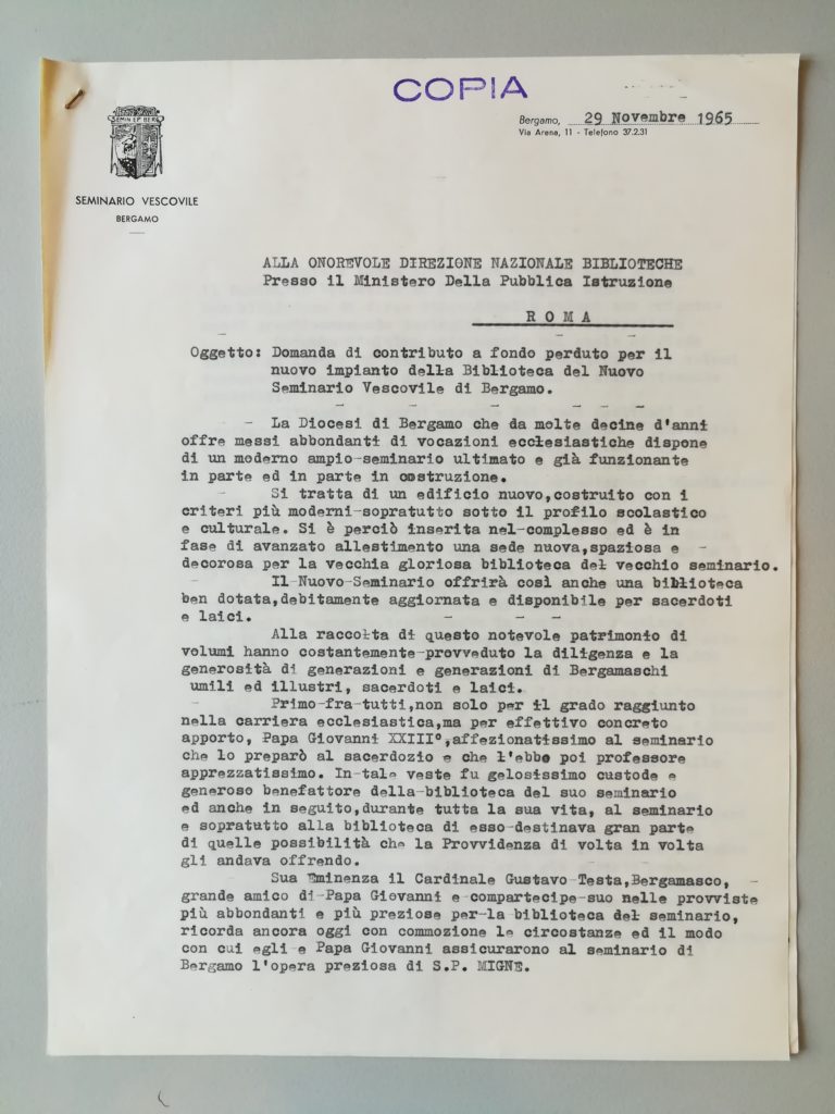 Durante i lavori di ristrutturazione degli edifici seminariali negli anni Sessanta del secolo scorso, si è deciso di dare alla biblioteca una posizione primaria nella struttura del complesso di fabbricati, collocandola al centro di un nuovo ambiente scolastico e culturale e rendendola dotata, aggiornata e disponibile alla consultazione di seminaristi (alunni e professori) e laici. Pertanto, il 29 novembre 1965, mons. Clemente Gaddi, vescovo di Bergamo, invia un’istanza alla Direzione nazionale biblioteche del Ministero della pubblica istruzione per ottenere un contributo per il nuovo impianto della biblioteca, in quanto era «in fase di avanzato allestimento una sede nuova, spaziosa e decorosa per la vecchia gloriosa biblioteca del vecchio Seminario».